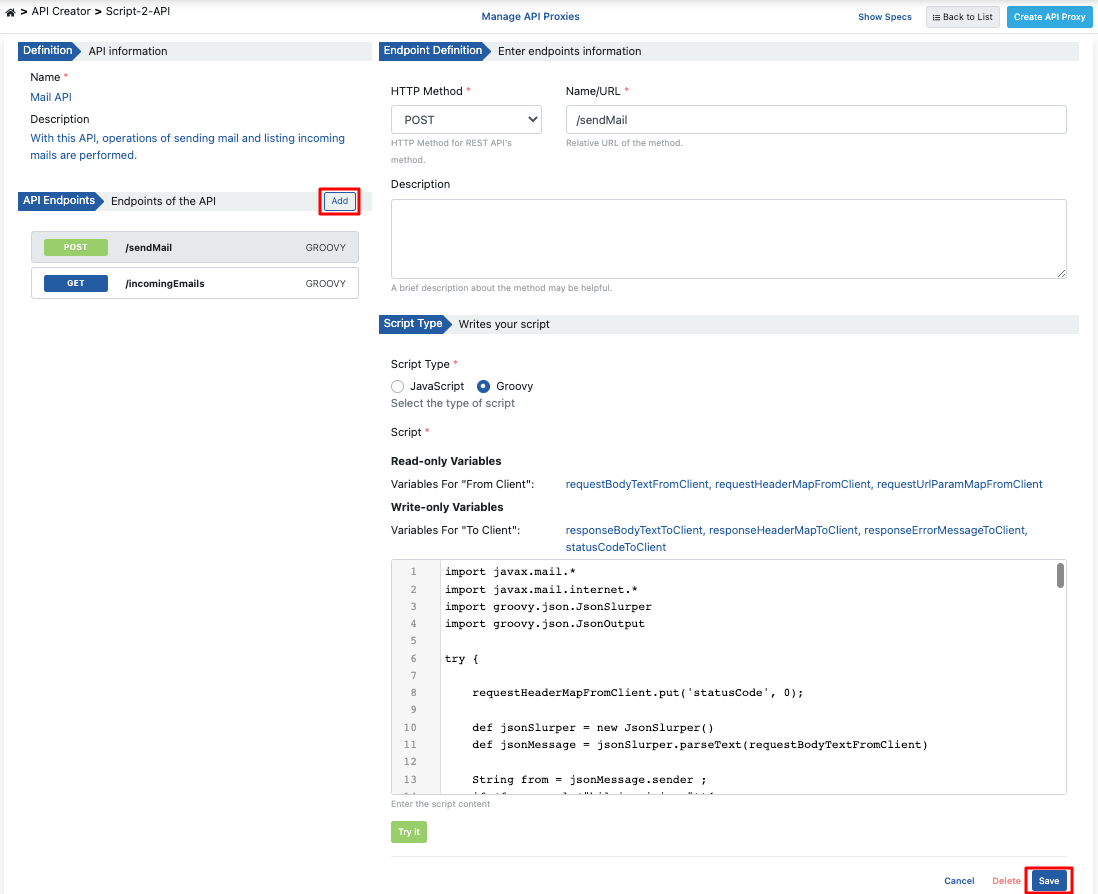 Script-2-API, herhangi bir kod editörüne ihtiyaç olmadan JavaScript veya Groovy script dilleri ile metotlar oluşturarak REST API oluşturmanızı sağlar.