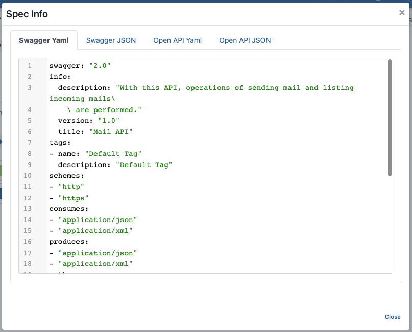 Mail API'ye ait API tanım dosyalarına erişmek için Spec'leri Göster (Show Specs) linkine tıklanır.
