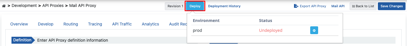 Bu işlemin yönetimi API Proxy ekranındaki Yükle (Deploy) butonuyla açılan diyalog üzerinden gerçekleştirilebilir.