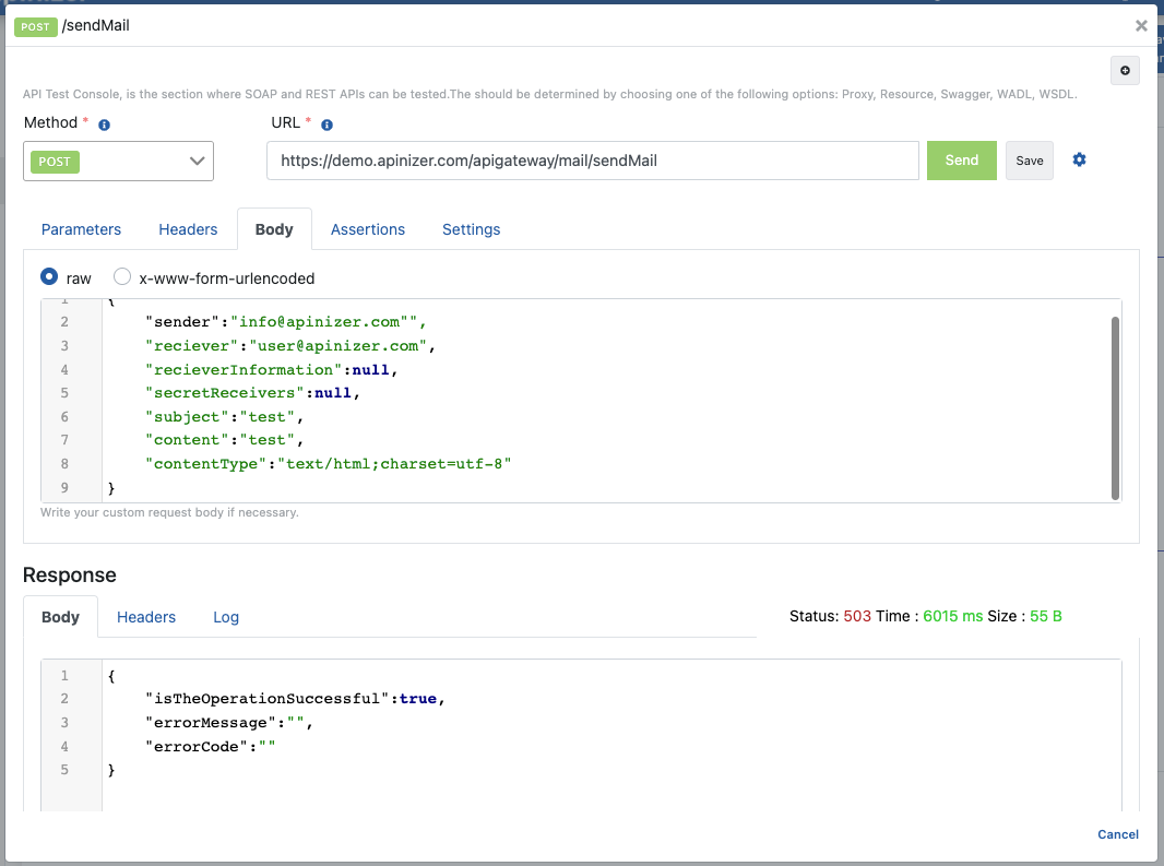 API Proxy sayfası üzerinden /sendMail metodunun test edilmesini içeren görsel aşağıdadır;