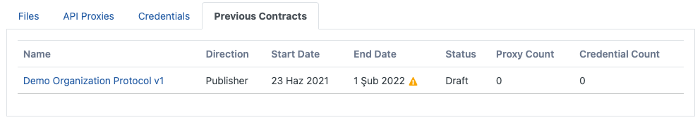 (Use End Date for Credentials) | Bu seçenek aktif hale getirildiğinde sözleşme/protokol ile ilişkilendirilmiş kimlik bilgilerinin kullanım izni sözleşme süresinin dolmasıyla birlikte otomatik dolar ve yeni istek yapamaz hale gelirler. Tabii bu ayarın geçerli olması için ilişkili API Proxy üzerinde kimlik doğrulama politikalarından birisi eklenmiş olmalı ve bu politikada kimlik doğrulama şekli olarak Security Manager seçeneği seçili olmalıdır. |