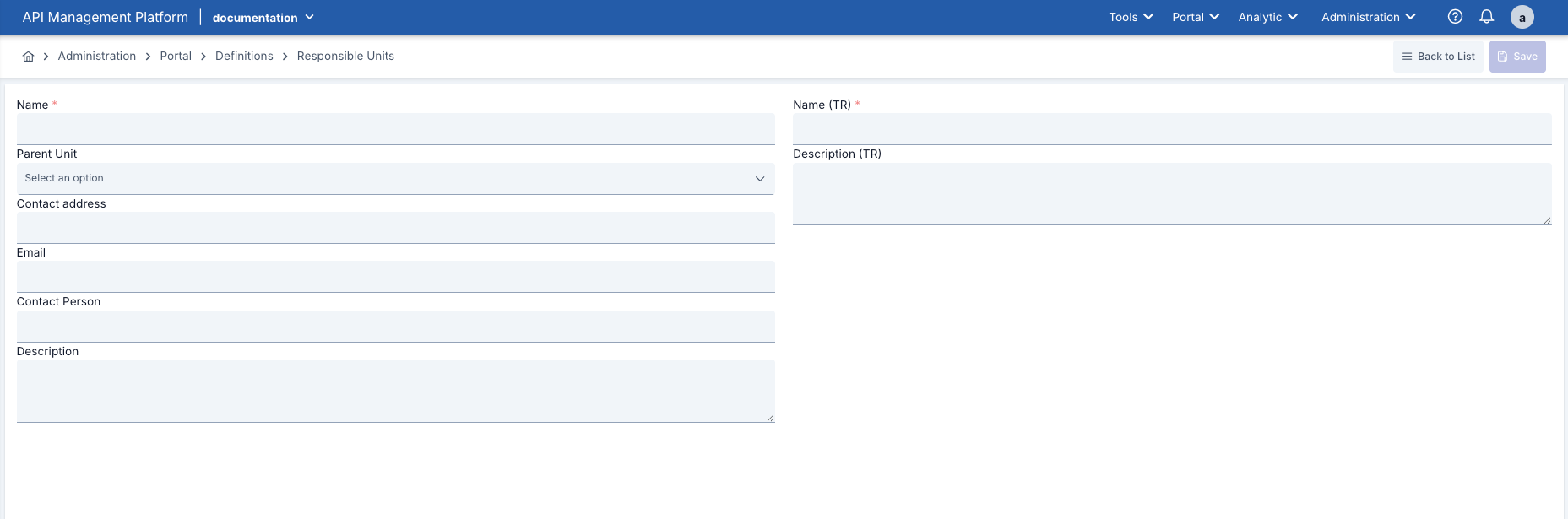 Bu ekran, kurum bünyesinde API Ürünlerinin yönetiminden sorumlu olacak yeni birimlerin tanımlanması için kullanılır. Form üzerindeki alanlar doldurularak yeni bir birim oluşturulur. Gerekli alanlar eksiksiz girildiğinde Save butonuna tıklanarak kayıt işlemi tamamlanır.