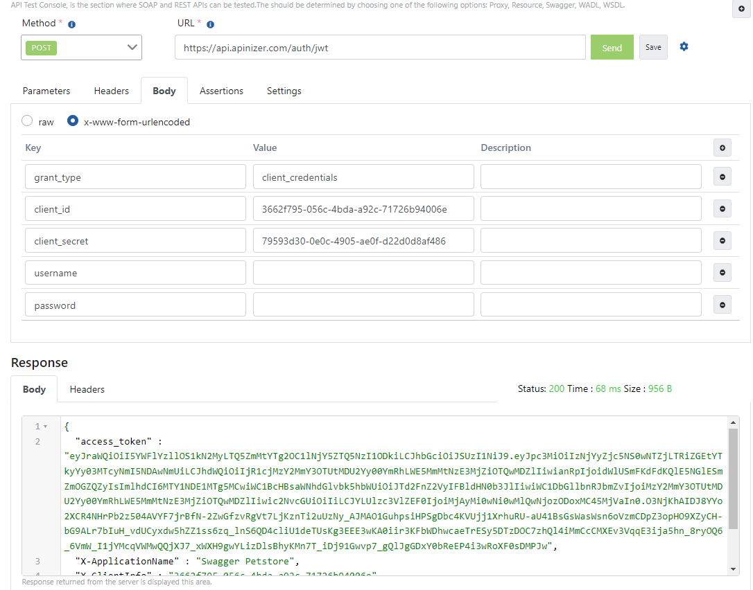Apinizer Test Konsolu üzerinden Token Servisine istek gönderme ayarlarını içeren görsele aşağıda yer verilmiştir: