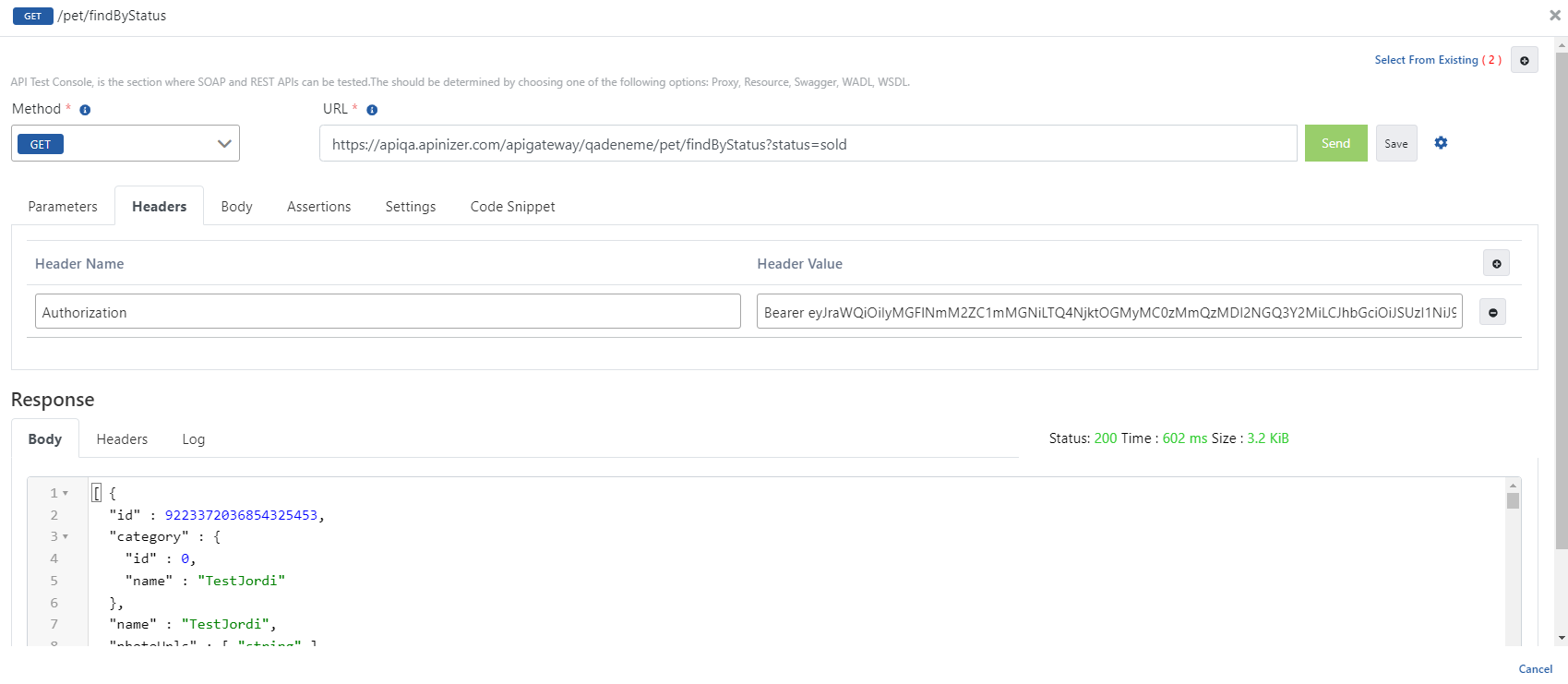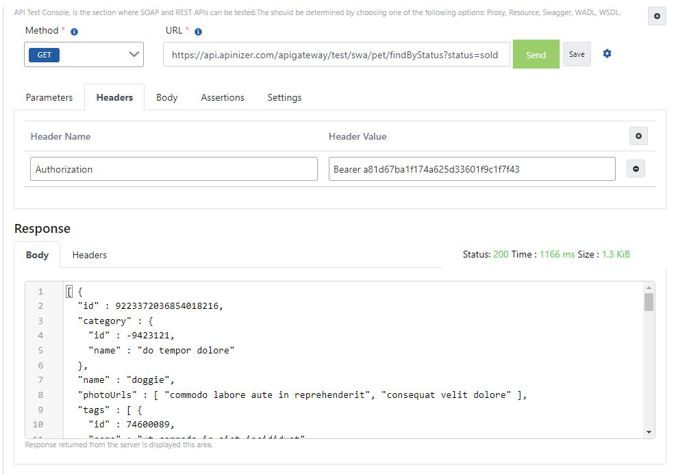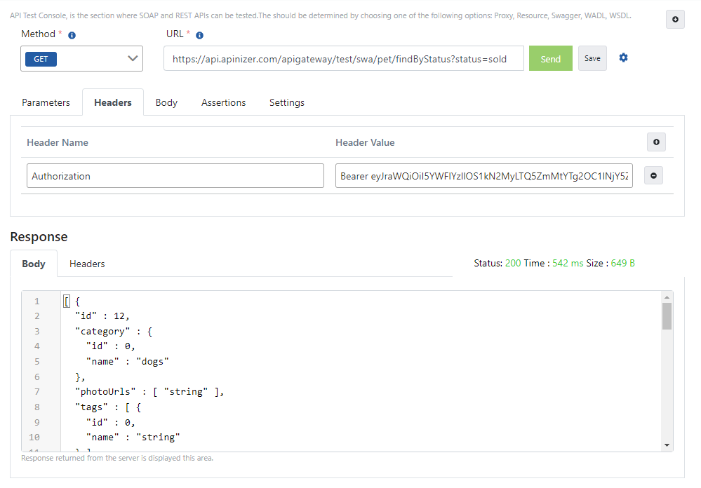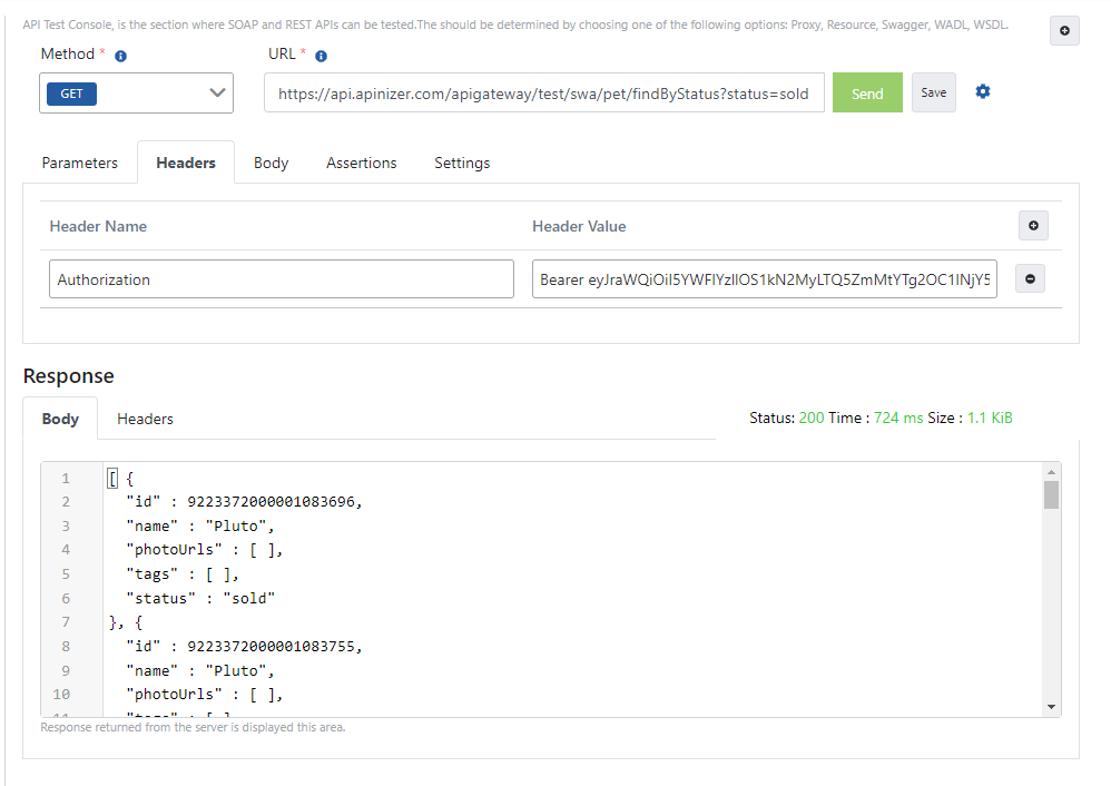 Apinizer Test Konsolu üzerinden token bilgisiyle istek gönderme işlemini içeren görsele aşağıda yer verilmiştir:
