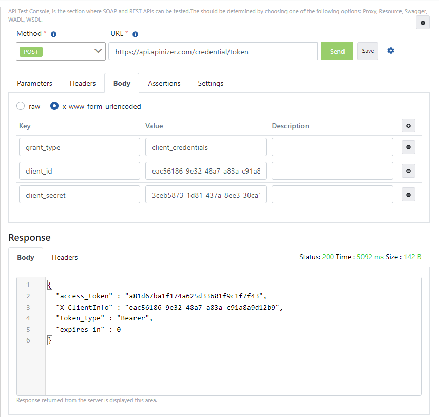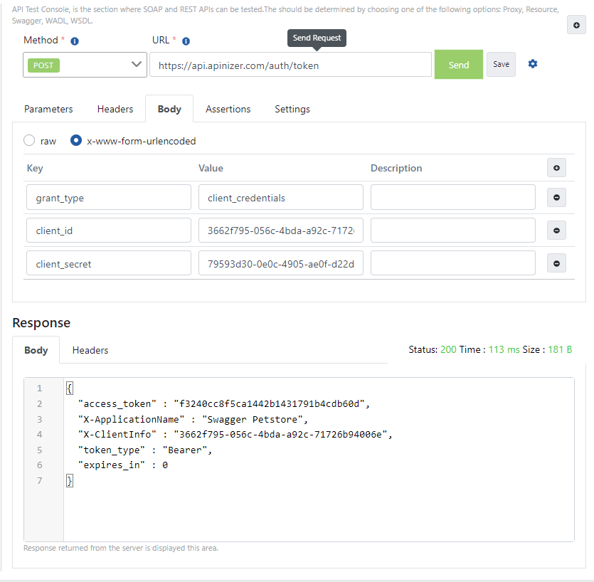 - HTTP Metodu POST olmalıdır. Body alanında "x-www-form-urlencoded" değeri seçilmelidir. Eğer Apinizer Test Konsolu kullanılmıyor ise "Content-Type" adı ve "application/x-www-form-urlencoded" değeri ile bir başlık eklenmelidir.