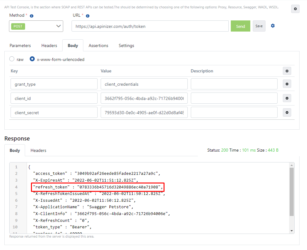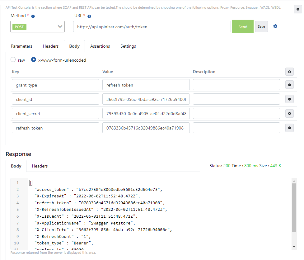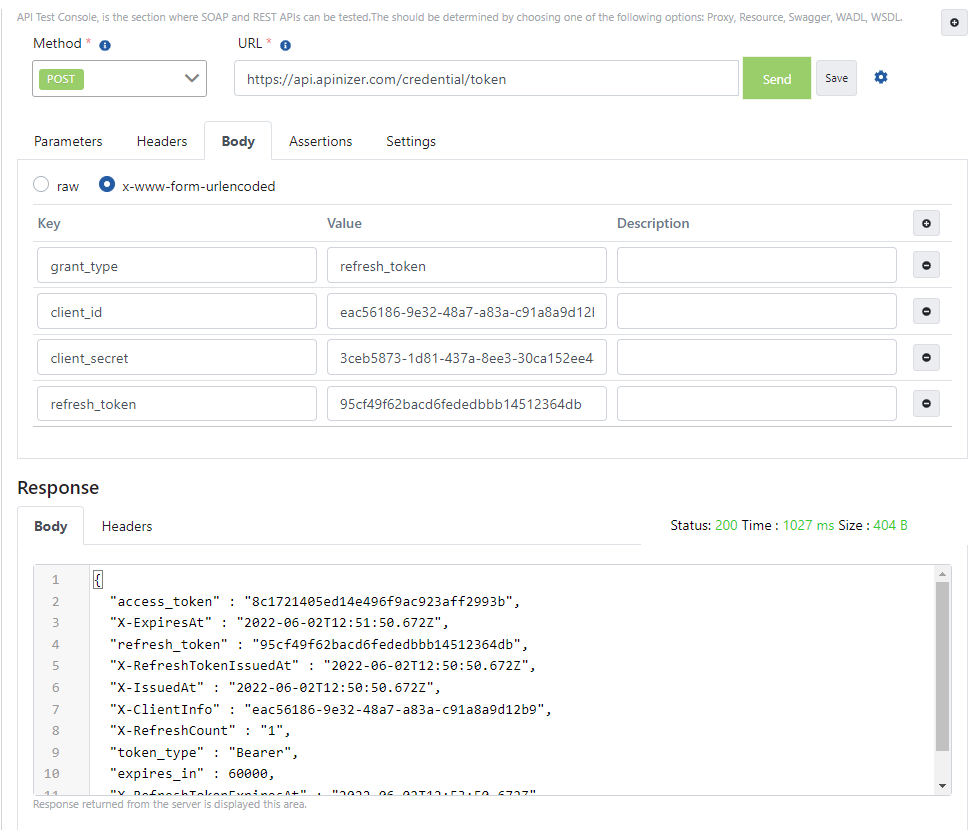 Apinizer Test Konsolu üzerinden token yenilemek için gönderilen istek örneğine ait görsele aşağıda yer verilmiştir: