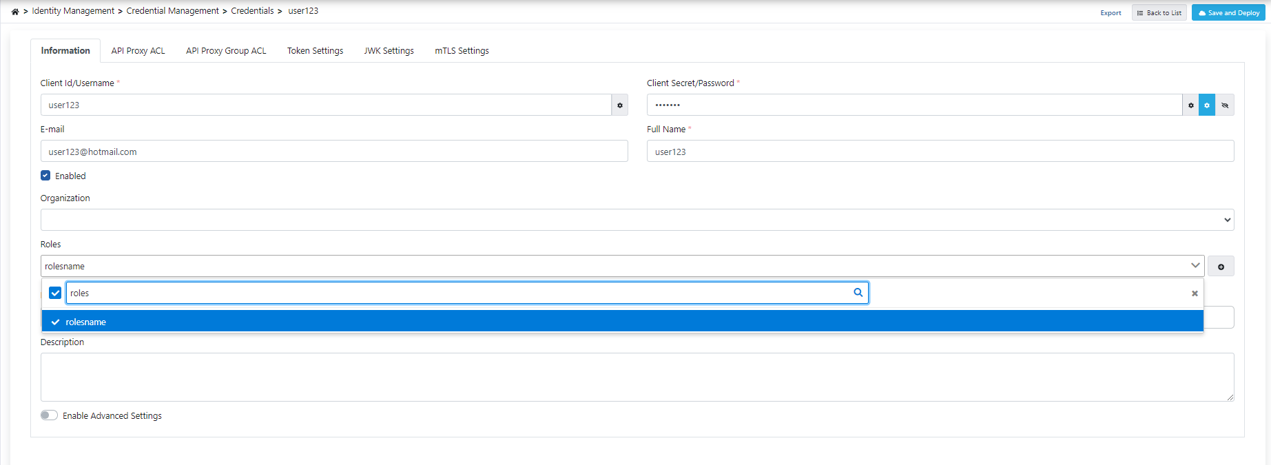 - Kullanıcıya rol tanımlaması için aşağıdaki gibi roles kısmından yeni bir rol eklenip kullanıcıya API Proxy ACL kısmından o Proxy eklenmelidir.