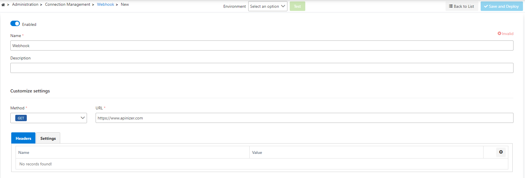Apinizer Dokümantasyonu Geliştirici Kılavuzu (Developer Guide) Bağlantı Konfigürasyonları (Connection Management) Current: Webhook Webhook Bu sayfada Webhook bağlantı ayarlarının nasıl yapıldığı anlatılmaktadır.Webhook ayarlarını içeren görsele aşağıda yer verilmiştir:Webhook konfigürasyonu için kullanılan alanlar aşağıdaki tabloda görülmektedir.AlanAçıklamaAktif(Enabled)Bağlantının aktiflik durumu.Adı(Name)Yapılacak ayarın ad bilgisidir.Açıklama(Description)Açıklama girilebilir.Metot(Method)Test edilecek URL'nin Http Metodu Tipi bilgisi.URLİstenilen uç noktanın URL'i girilebilir ya da mevcut proxy'ler ya da kayıtlı test verisi içerisinden seçilebilir.Başlık Değerleri(Header Name-Value)HTTP İstek başlıkları (hedef adres için gerekliyse) buradan ayarlanabilir.Zaman Aşımı(Timeout)Saniye cinsinden zaman aşımı süresini belirtir. ×