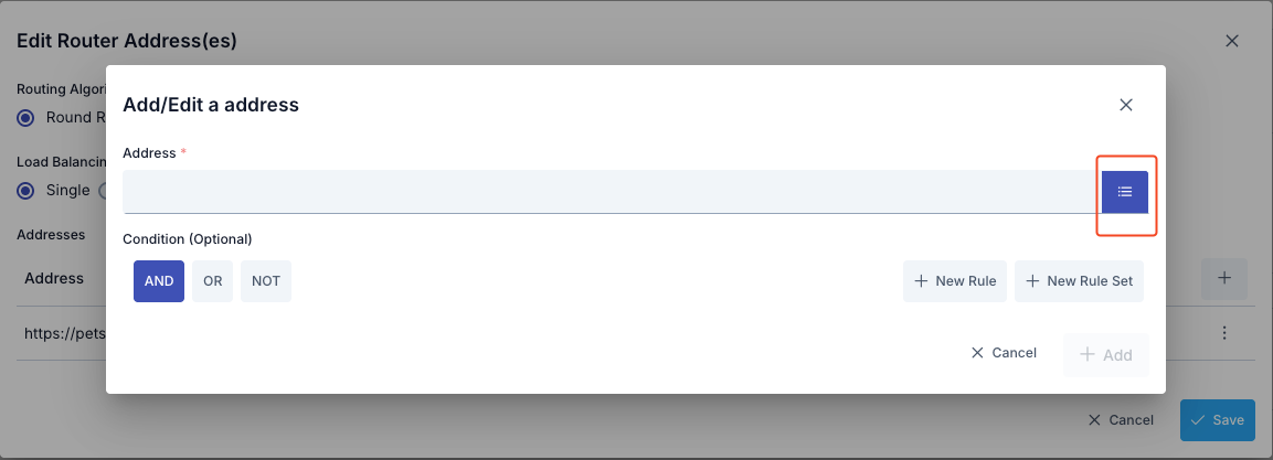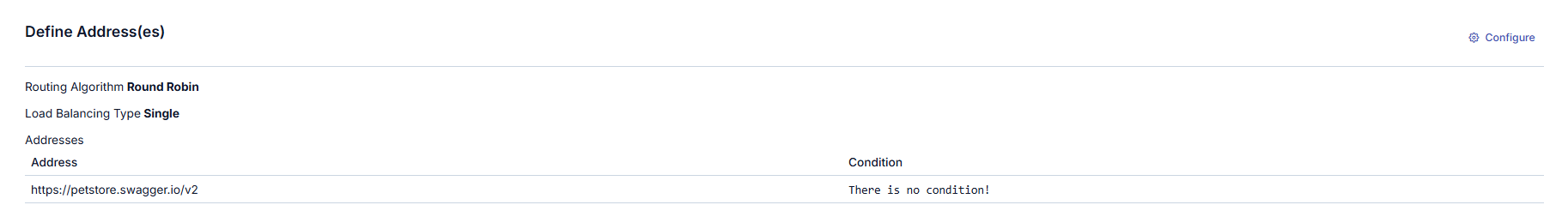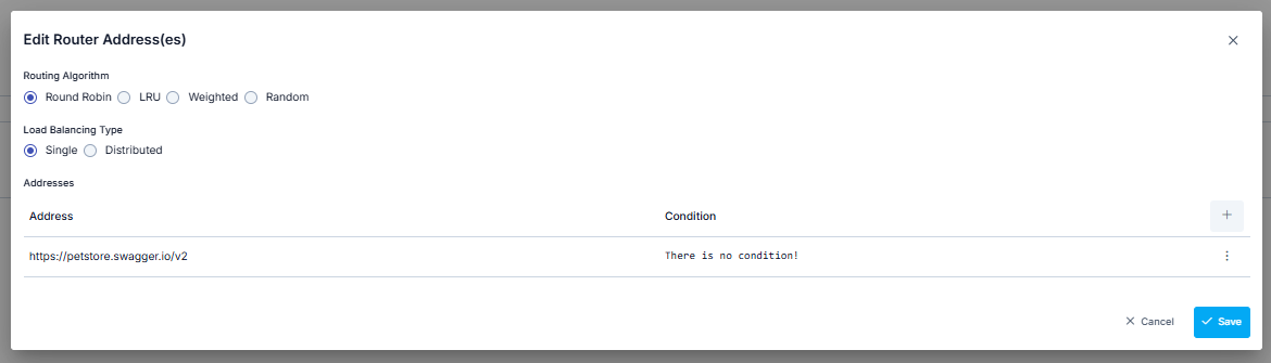 Adres güncelleme ya da ekleme işlemleri için açılan penceredeki Koşul (Condition) bölümü, istemciden gelen mesajların bu adrese gönderilmesi için koşul tanımlama olanağı verir. Böylece örneğin özel bir başlık ya da parametre değeri ile gelmeyen isteklerin tanımlı adreslerden sadece belirli bir ya da daha fazlasına yönlendirilmesi sağlanabilir.