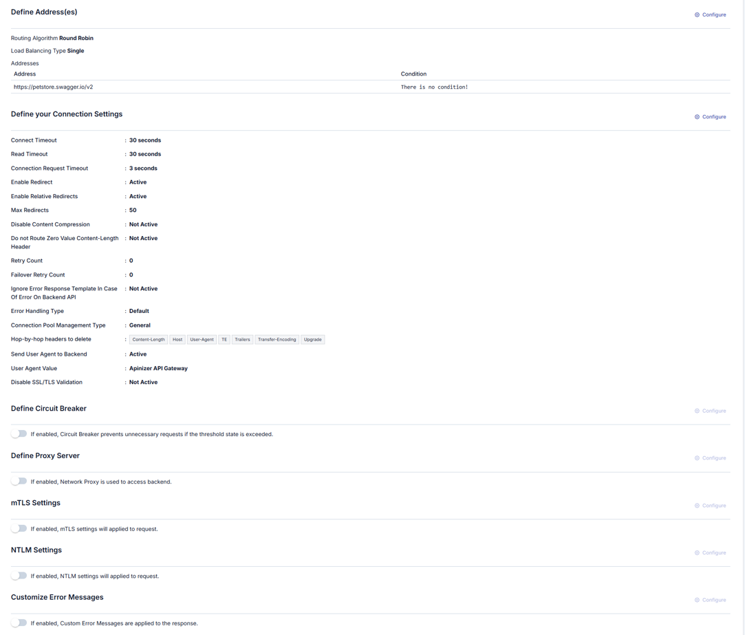 Etkinleştirildiğinde, istek mesajının yönlendirileceği adres ayarları yapılır. (If enabled, the routing/upstream settings can be made.) | Bu ayarı etkinleştirerek trafiğin nasıl yönlendirileceği yönetilir. Kapalıysa istek backend'e gitmez, açıksa gidecek olan backend bilgileri girilebilir. | |