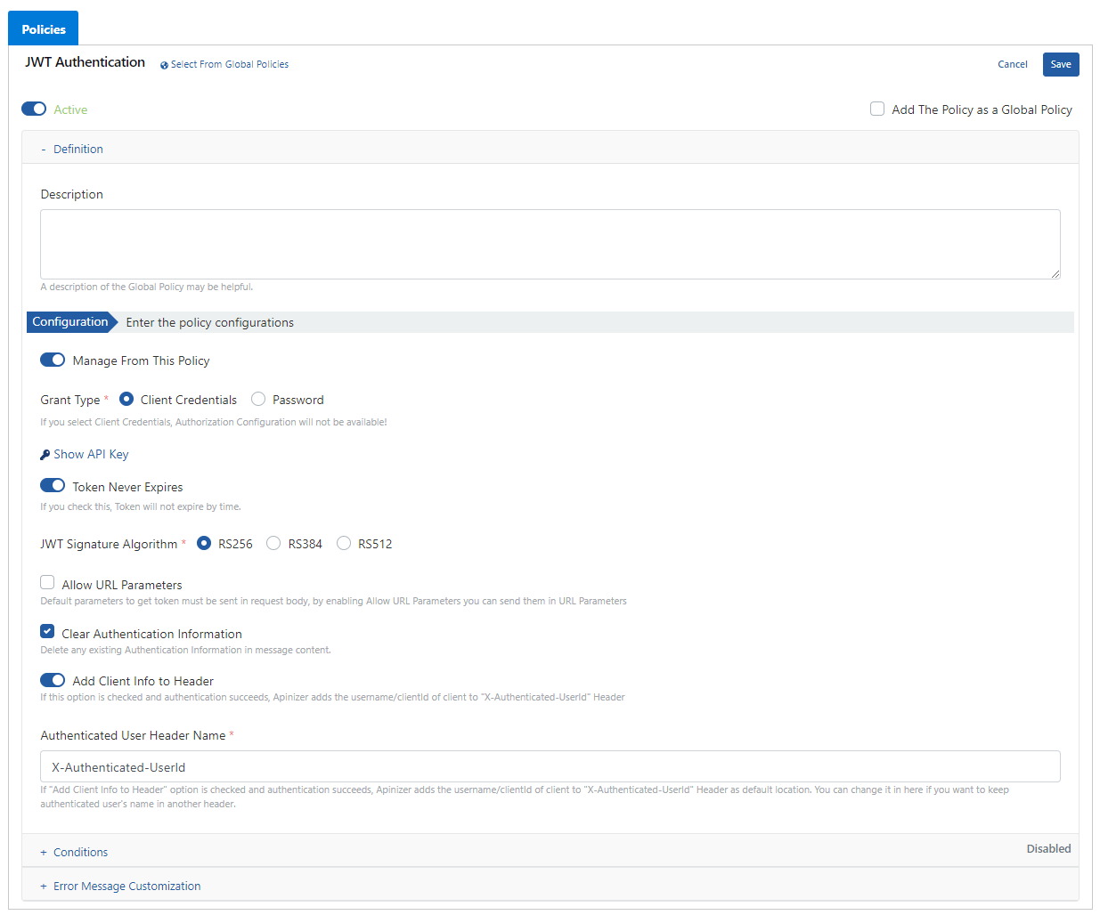 - If there is any authentication information in the message that will go to the backend API with the Clear Authentication Information field, this information will be deleted and not sent to the backend API.