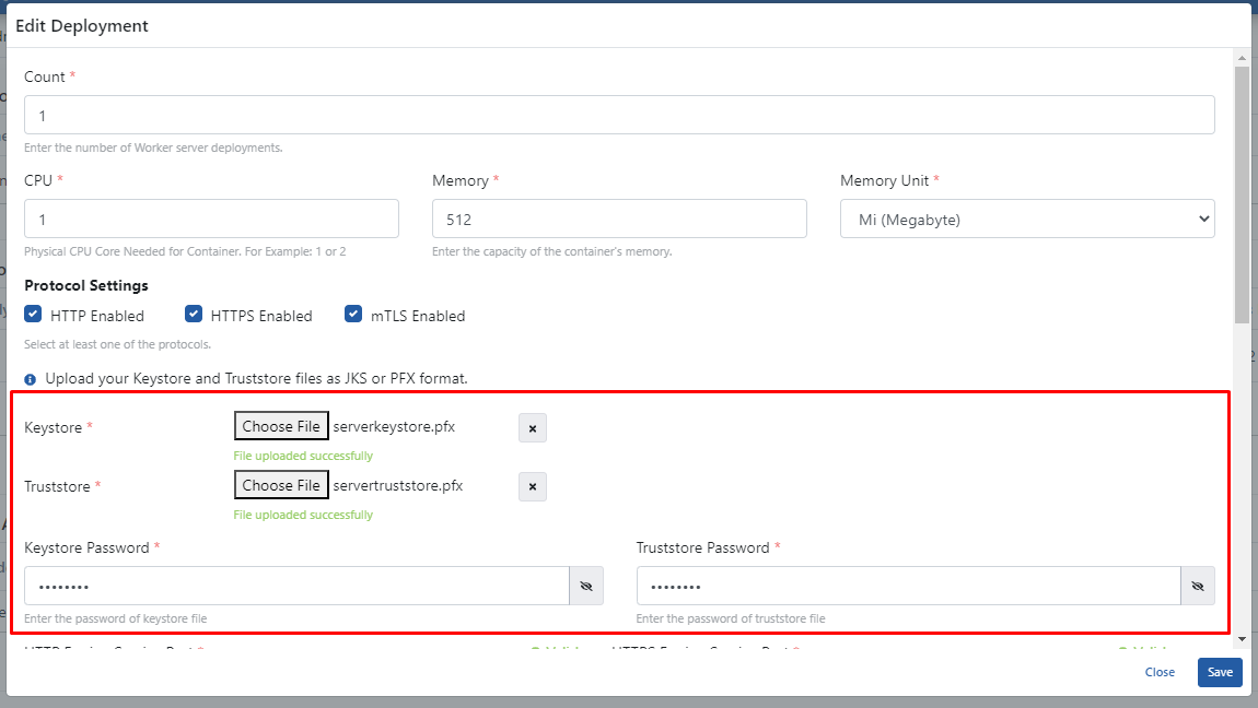 The created serverkeystore.pfx and servertruststore.pfx files are added. Password information is entered. Click the Save button.