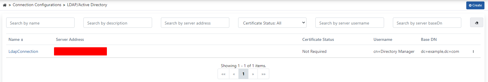 - To create the LDAP/Active Directory connection, click the Create button in the upper right corner.