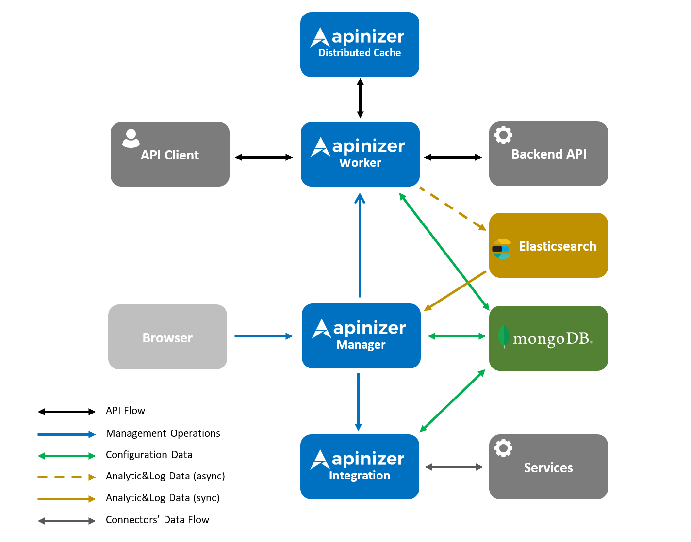 In this section, the architectural structure of Apinizer is explained covering the layout of the components that make up the platform, their interactions with each other and their contents.