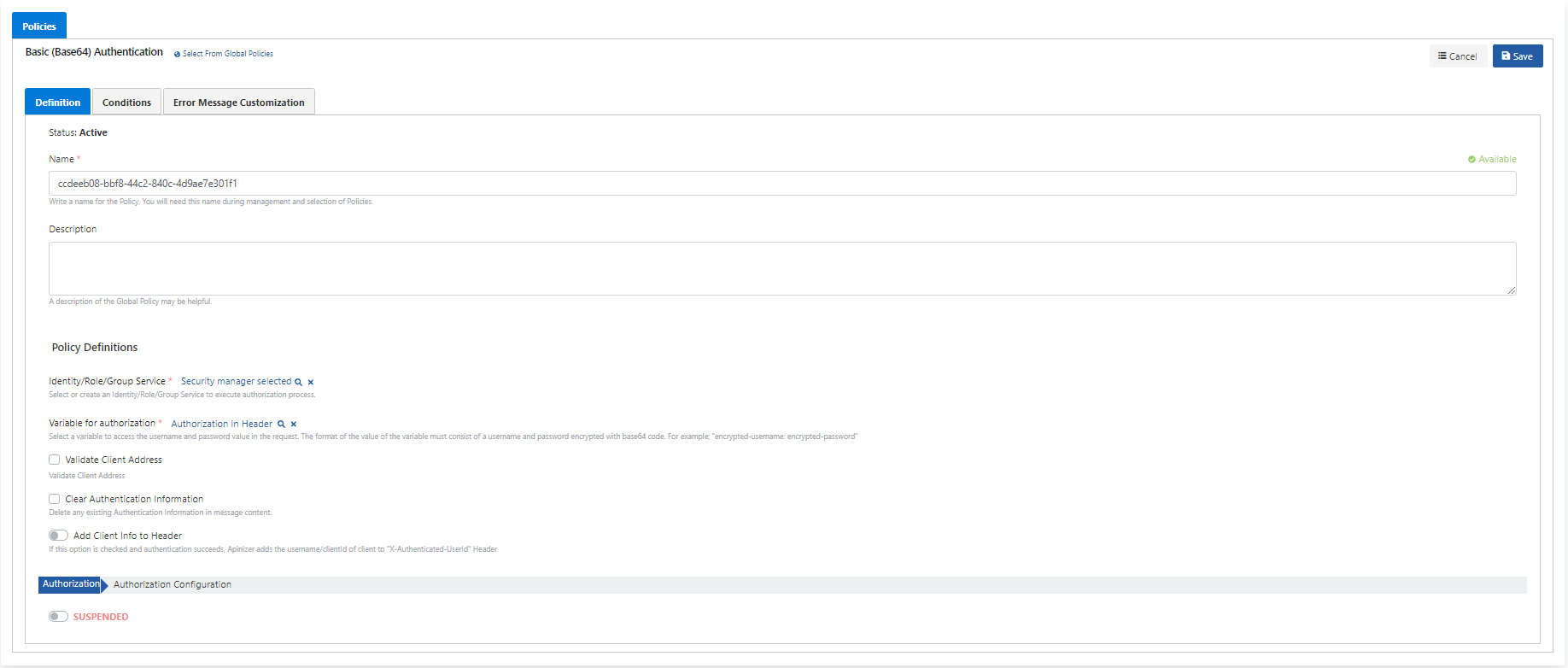 For the use of this policy, the username and password information must be combined with a colon (:) character and encrypted with the Base64 algorithm. Generally, it is used in the message header with the "Authorization" key and the phrase "Basic" before it, but it can be sent in other parts of the message, although it is rare. Apinizer can offer solutions for all possibilities with the concept of variables.