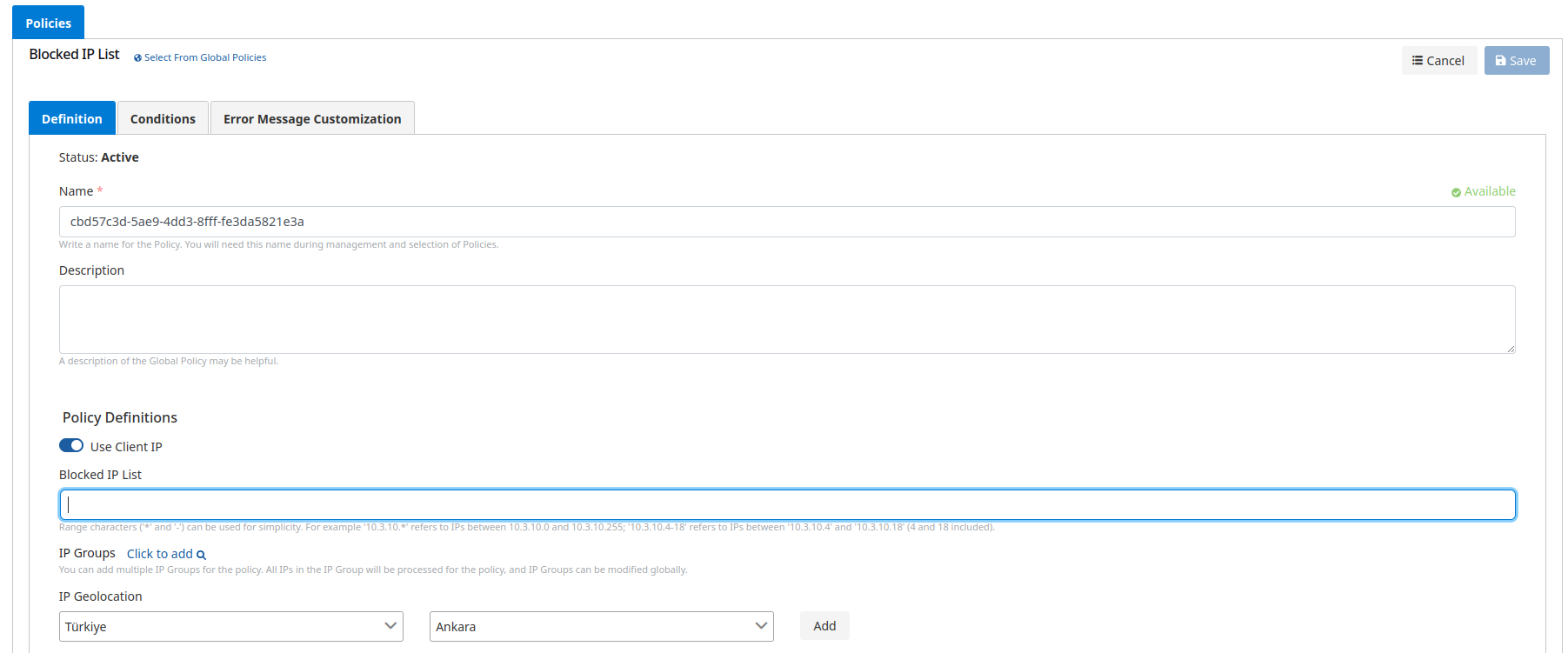 With the Blocked IP/Host List Policy, a list of IPs or IP ranges is defined so that requests from IPs in this list are rejected.