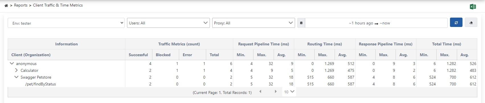 Client Traffic & Time Metrics includes metrics for usage summaries by grouping API Proxies in the project according to the username of credential information.