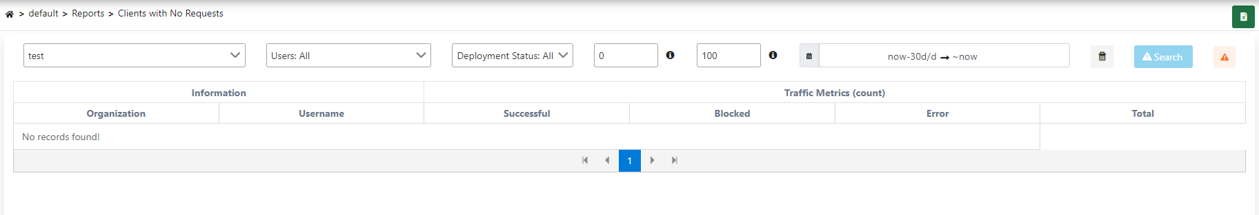 With Clients with No Requests report, you can access information about clients who do not send requests or send fewer requests during the specified date range.