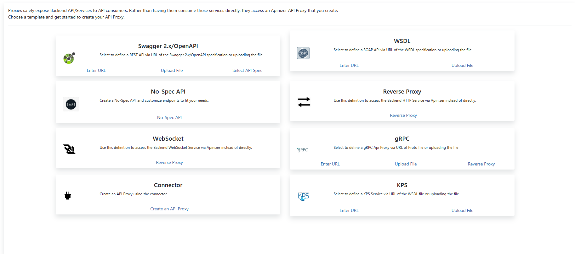 | WSDL (SOAP) | Used to create SOAP API Proxy from WSDL definition.. Click here for more information. |