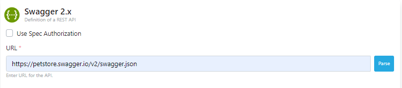 The Use Spec Authorization option is not needed for this example. Type the address https://petstore.swagger.io/v2/swagger.json in the URL field and click the Parse button on the right.