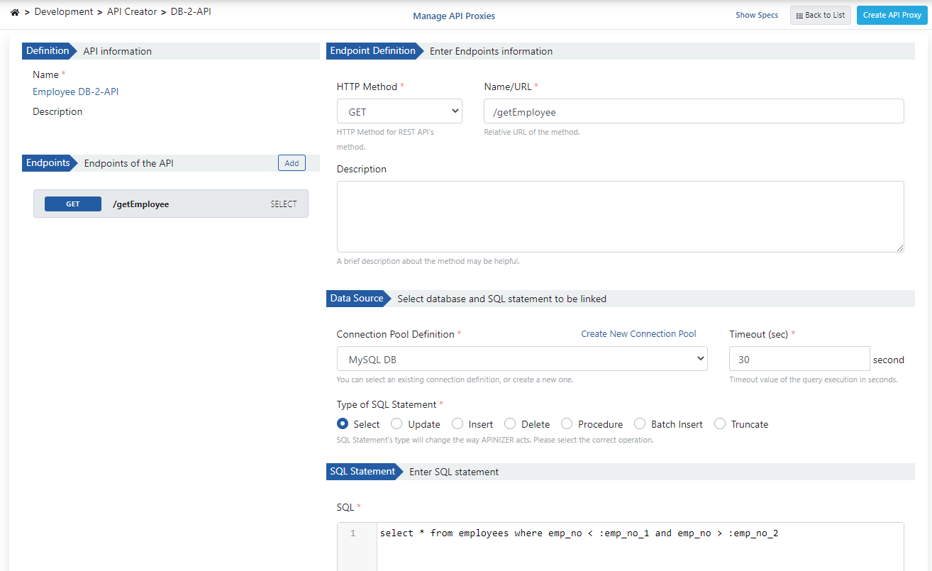 When DB-2-API is created, API and endpoint information are displayed on the left panel, and endpoint definition information is on the right.