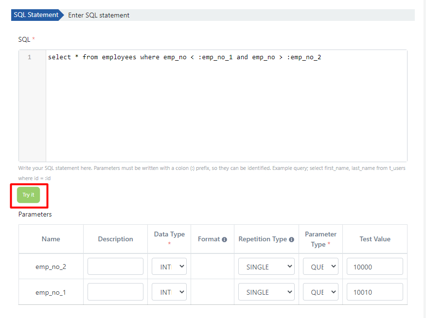After the endpoint is created, it can be tested with the Try It button by entering the defined parameters.