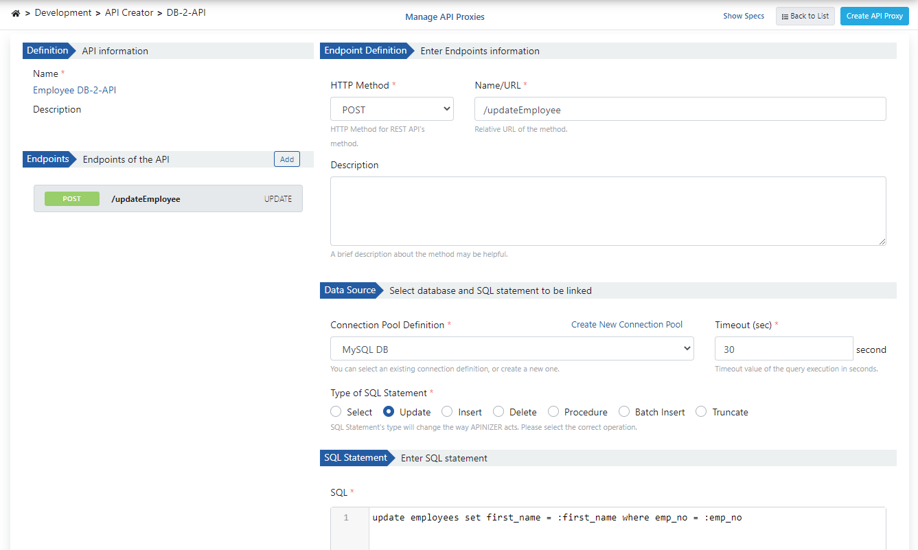 In this scenario, using Update on DB-2-API in Apinizer Platform will be explained.