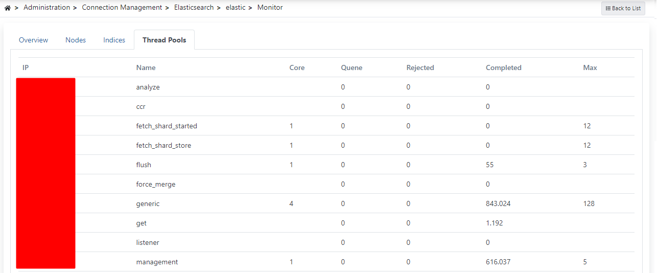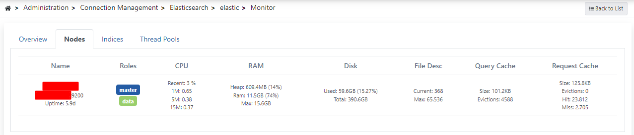 This screen provides instant monitoring of the general information, nodes, indexes and thread pools of the log servers of the Elasticsearch Cluster associated with the environment. Each information is available in the corresponding tab.