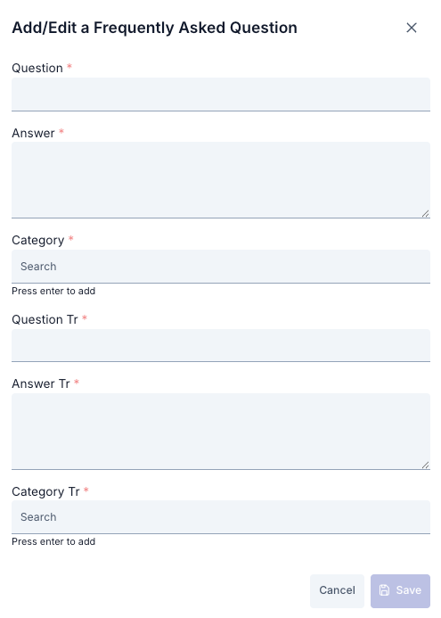 To create a new frequently asked question, click the Create (+) button in the upper right corner of the screen. In the window that opens (modal), complete the registration process by filling in the fields below. After filling in the required fields (marked with an asterisk (*)), click the Save button to add the record to the system.
