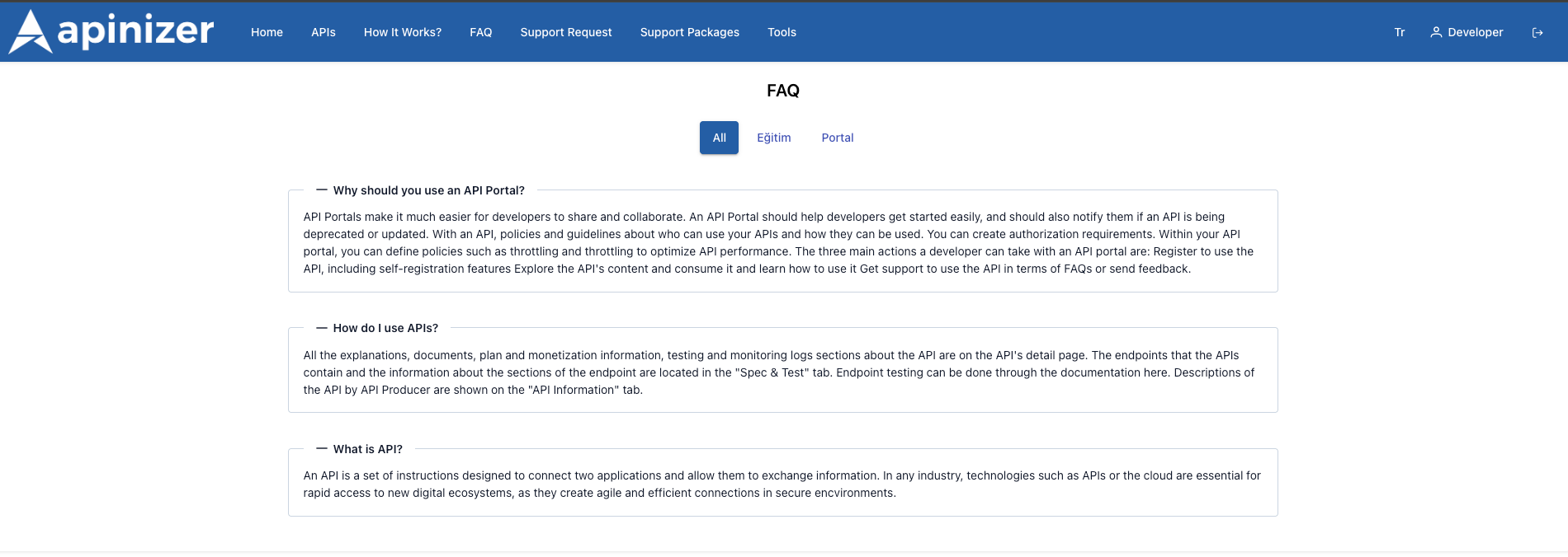 The API Developer Portal manages frequently asked questions and answers from users. Administrator users enhance the portal's user experience by defining question-and-answer content in both English and Turkish. This allows API consumers to quickly access frequently asked information through the portal.
