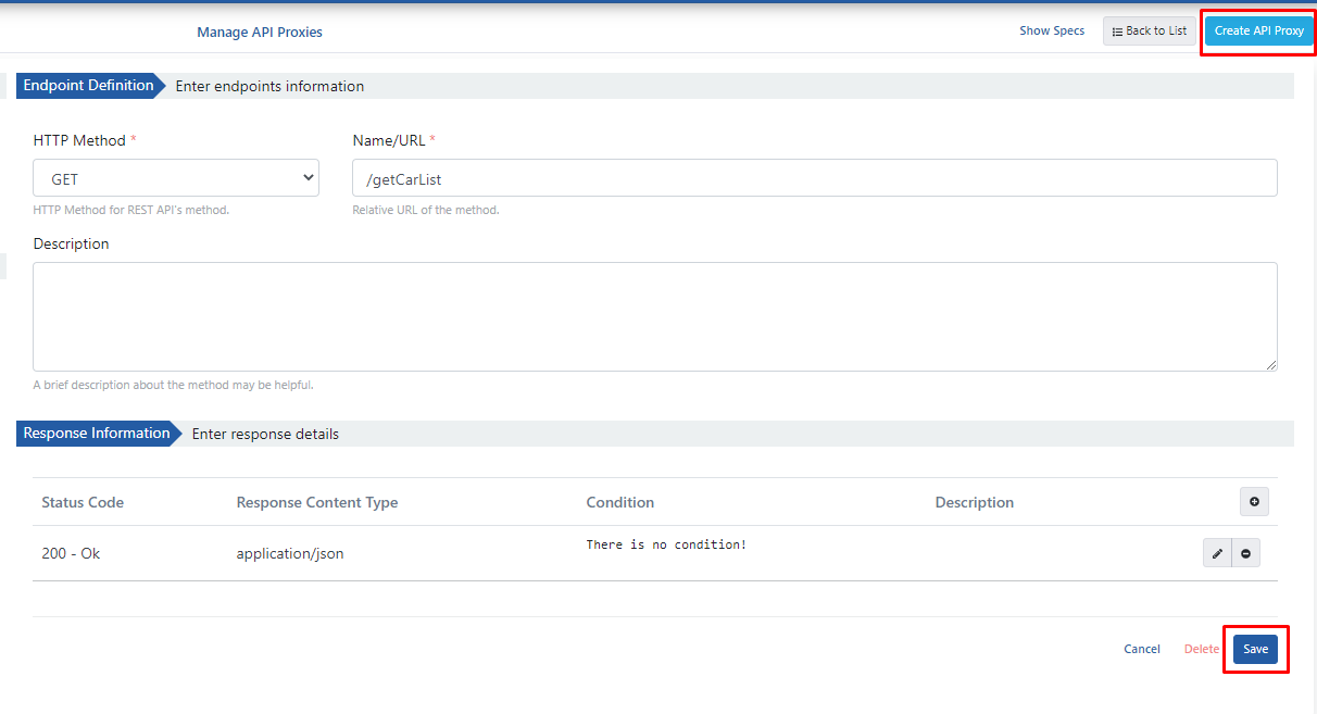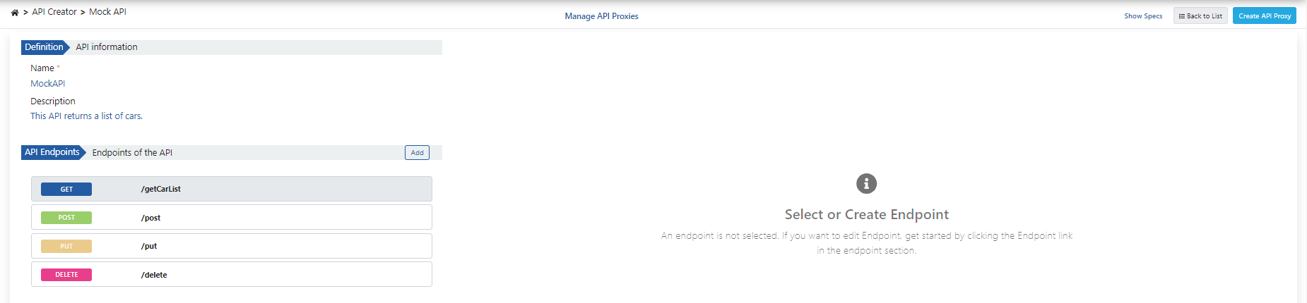 - API Endpoints -Endpoints of the API field contains the endpoints owned by Mock API.