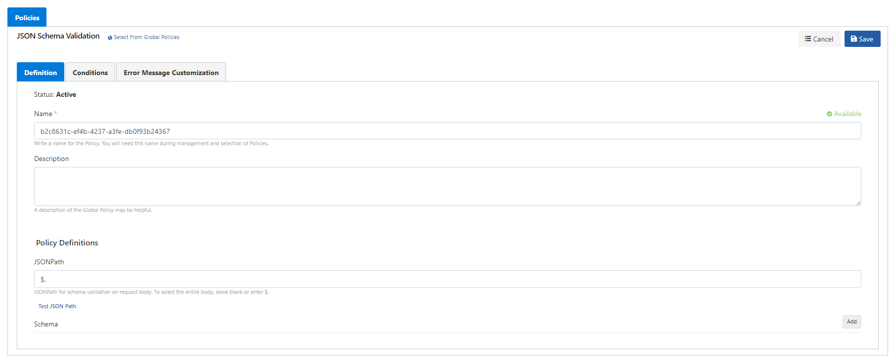 With the JSON Schema Validation Policy, the part of the incoming message specified with JSONPath is validated.