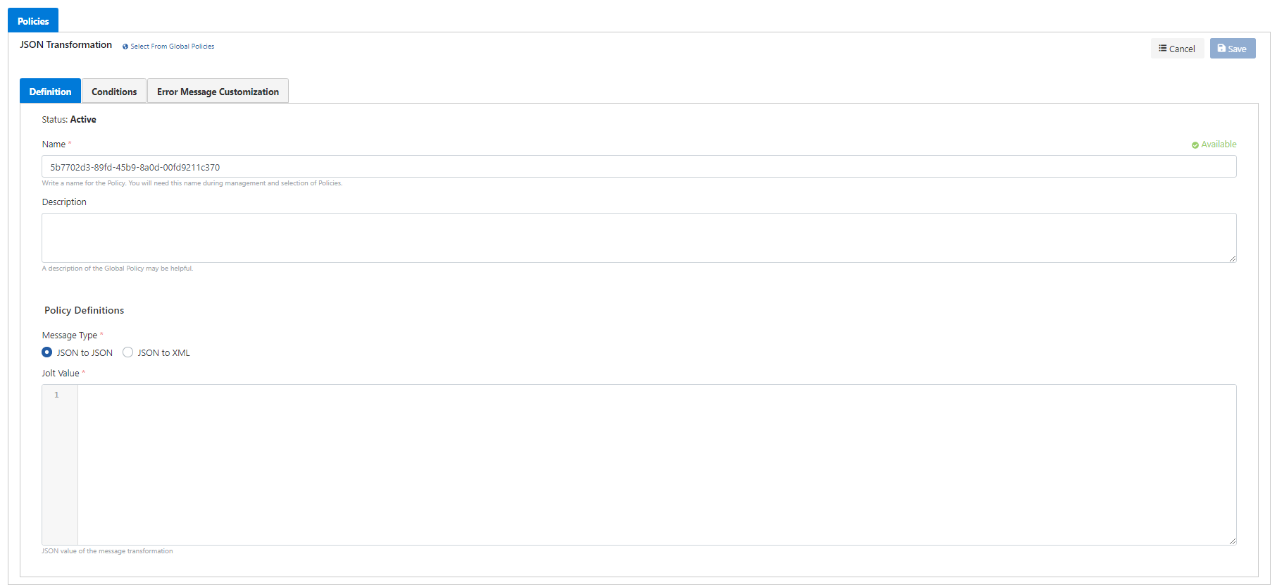 The message type can be selected as JSON to JSON or JSON to XML.