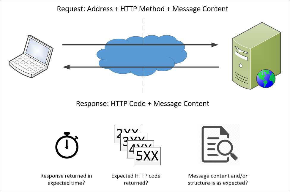 One or more monitors are defined to ensure that an API is up and running correctly and returns a response within the expected time. These monitors send request messages at specified intervals to the addresses given to them and wait for a response. If the response is not received within the expected time, or if the content of the response is not as expected, it is decided that there is a problem and some actions are triggered.