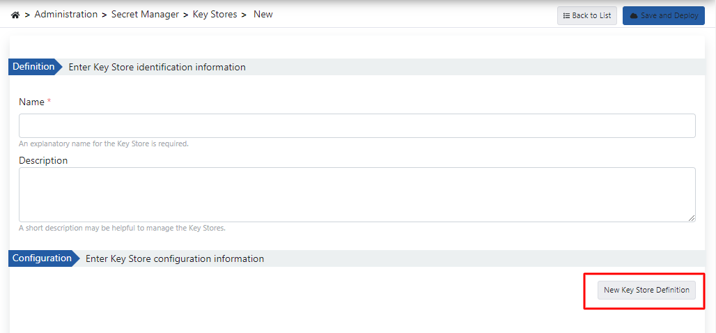 1) From the Administration → Secret Manager → Key Stores screen, click the Create button. Fill in the information under Definition. Then click on the New Key Store Definition button.