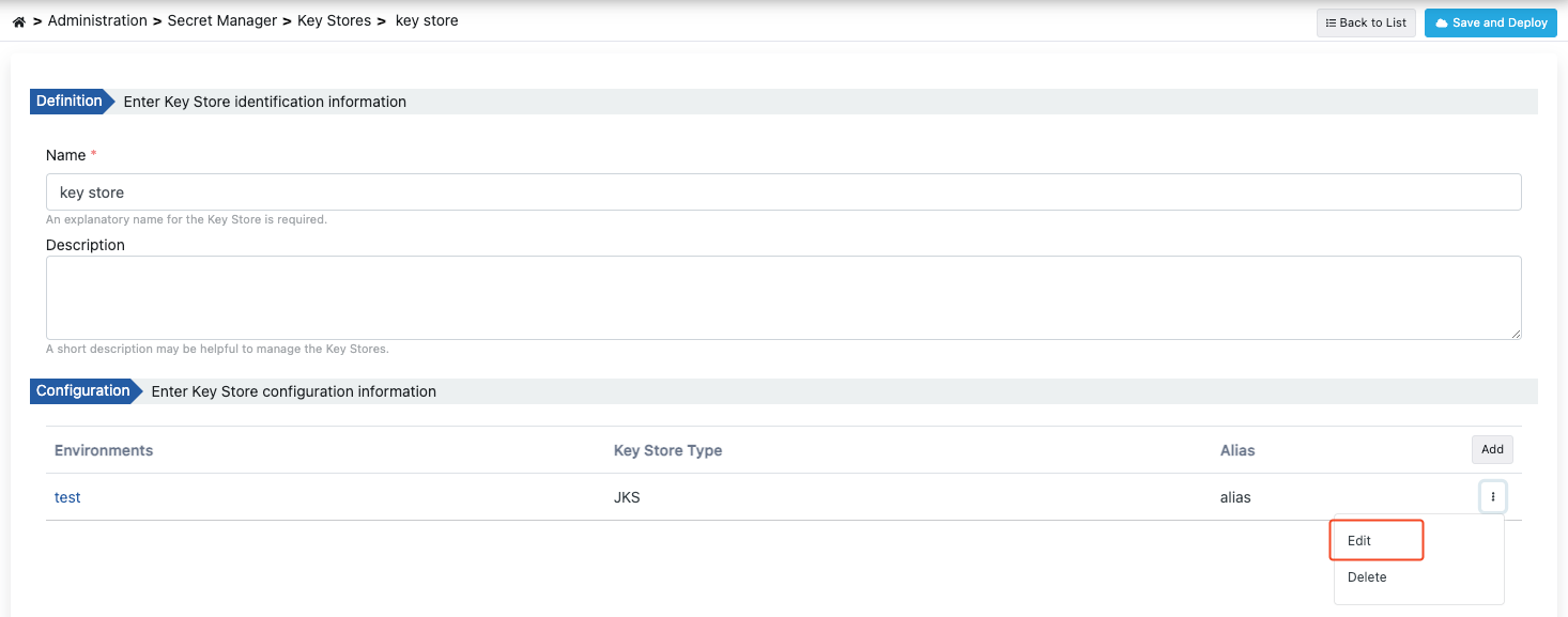 2) To edit the configuration information of Key Store, click on the Edit button from the menu under the configuration list.