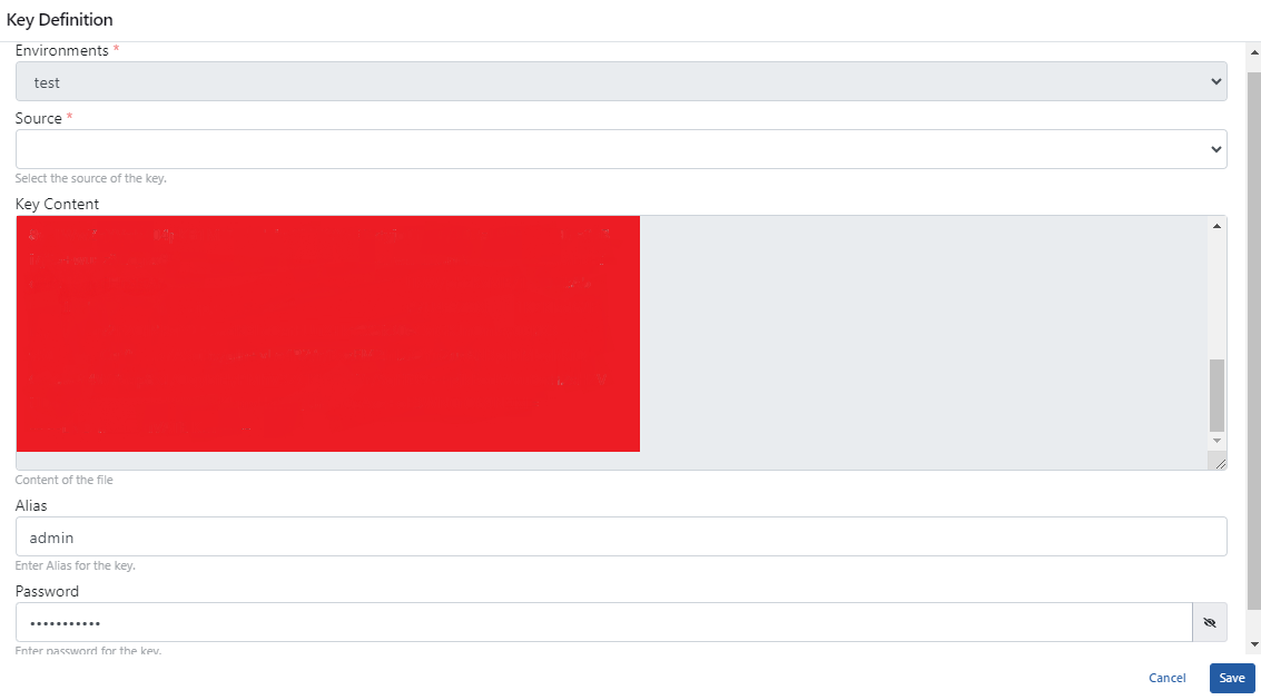 Source | The source from which the key will be obtained. There are two sections: - Upload key from a file