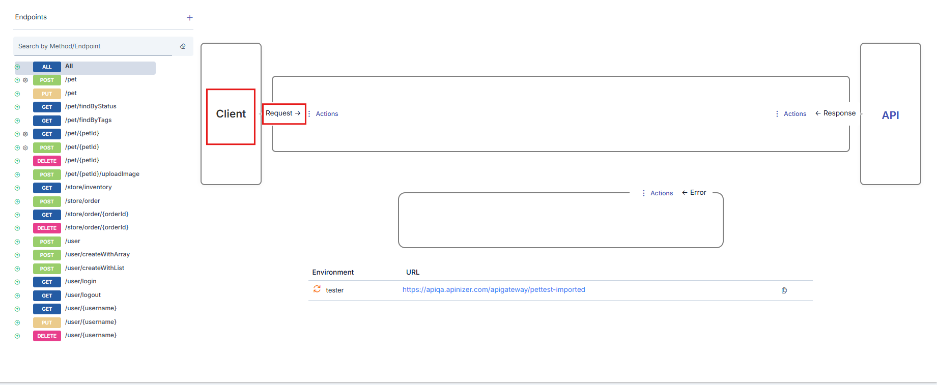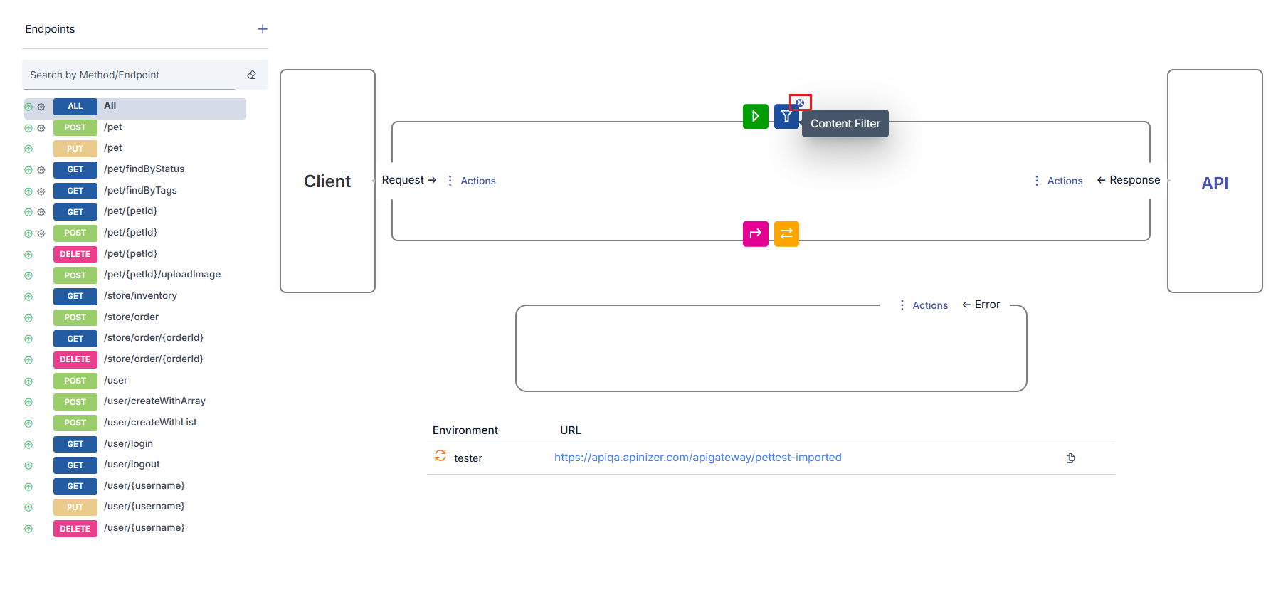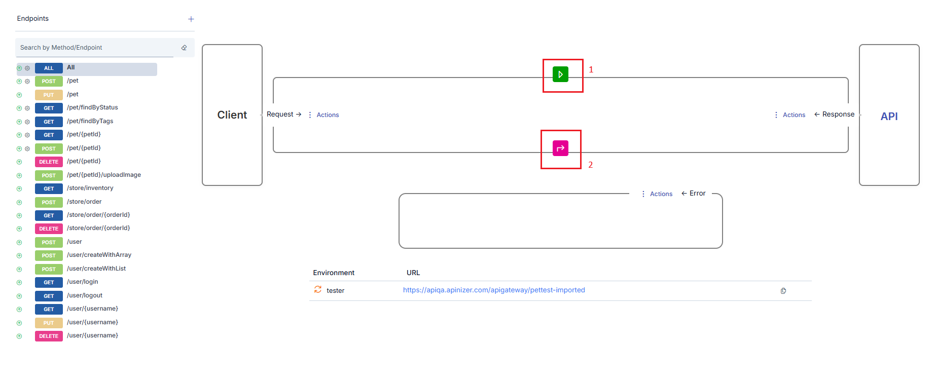 Displayed in the frame on the left side of the interface. It is the stakeholder that sends requests to the API Proxy. It initiates the flow. The message leaving the Client reaches the Backend API after policies are applied.