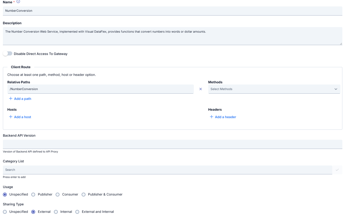 | Client Route | Defines which requests will be forwarded to this API Proxy and how they will be forwarded. This section consists of the following fields: 1. Relative Paths: Defines the path(s) that will be routed to the API Proxy. Example: /NumberConversion/calculatorEach path must start with a slash ("/"). 2. Methods: Defines which HTTP methods the API Proxy will accept. Example: • GET • POST • PUT • DELETE • PATCH • Any (default) If no method is specified, all HTTP methods are allowed by default. 3. Hosts: Specifies backend host addresses for the API Proxy. It is possible to use multiple hosts. Host definition may be preferred in multi-domain structures or in specific partner-based isolations. 4. Headers: Allows API Proxy to accept requests only if specific header conditions are met. Used for header-based traffic routing or separation scenarios. For more details, see API Proxy Client Route Usage Guide |