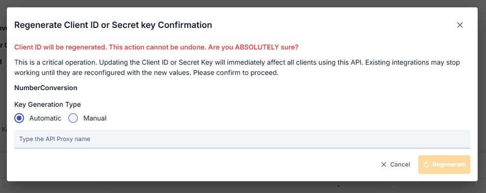 This dialog serves as a warning that regenerating the Client ID or Secret is an irreversible and critical operation. To confirm the action, you must enter the API Proxy name and select the key generation type (Automatic or Manual).