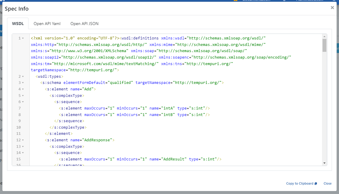 The contents of the definition files are displayed as shown in the figure above when the Show link is clicked and they can be copied from here. However, this method is for users such as API Developers, API Testers which works on the Apinizer platform. Clients (API Consumers) cannot access these interfaces.