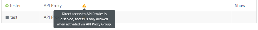 If the relevant API Proxy is included in a Group and the option to Disable Direct Access to API Proxies is selected on the API Proxy Group screen, a warning box will appear in this section.