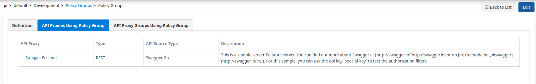 The visual below shows the list of API Proxies and API Proxy Groups using the Policy Group: