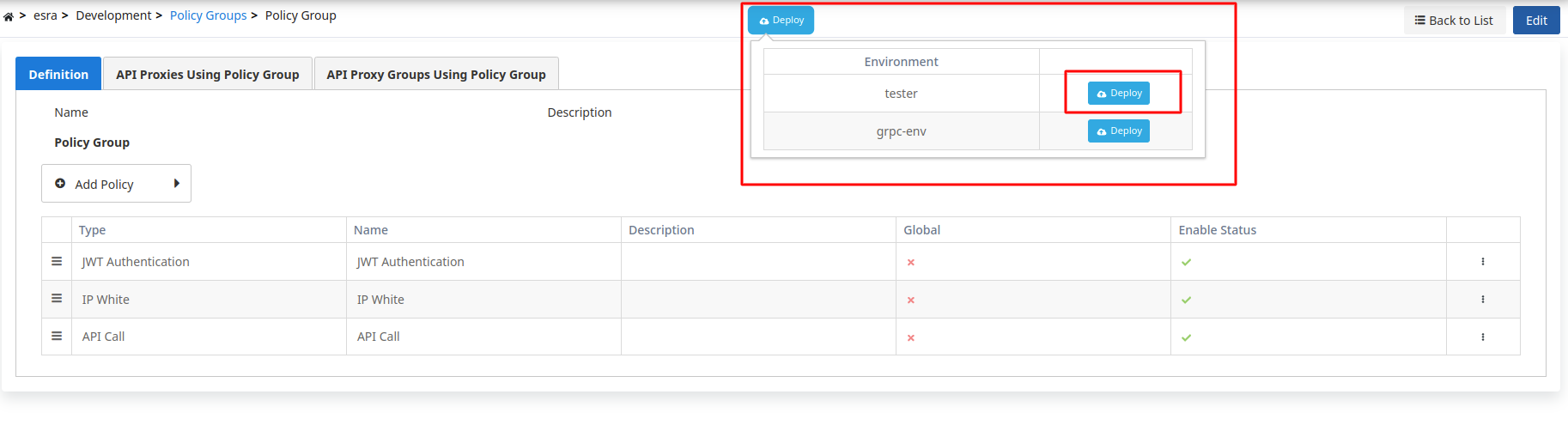 When any changes are made to the policy group, the status of the API Proxies and API Proxy Groups using this group changes to "Redeploy Required". Instead of deploying them one by one, the "Policy Group Deploy" feature allows all API Proxies and API Proxy Groups using this policy group to be deployed collectively to a specific environment.