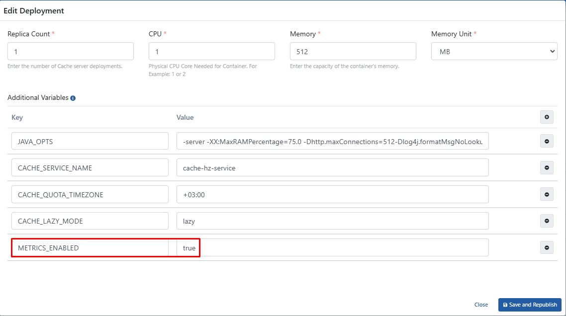 In order for Apinizer Cache to broadcast metrics over port 9091, the relevant container must be set to -name as environment variable: METRICS_ENABLED=TRUE parameter must be defined.