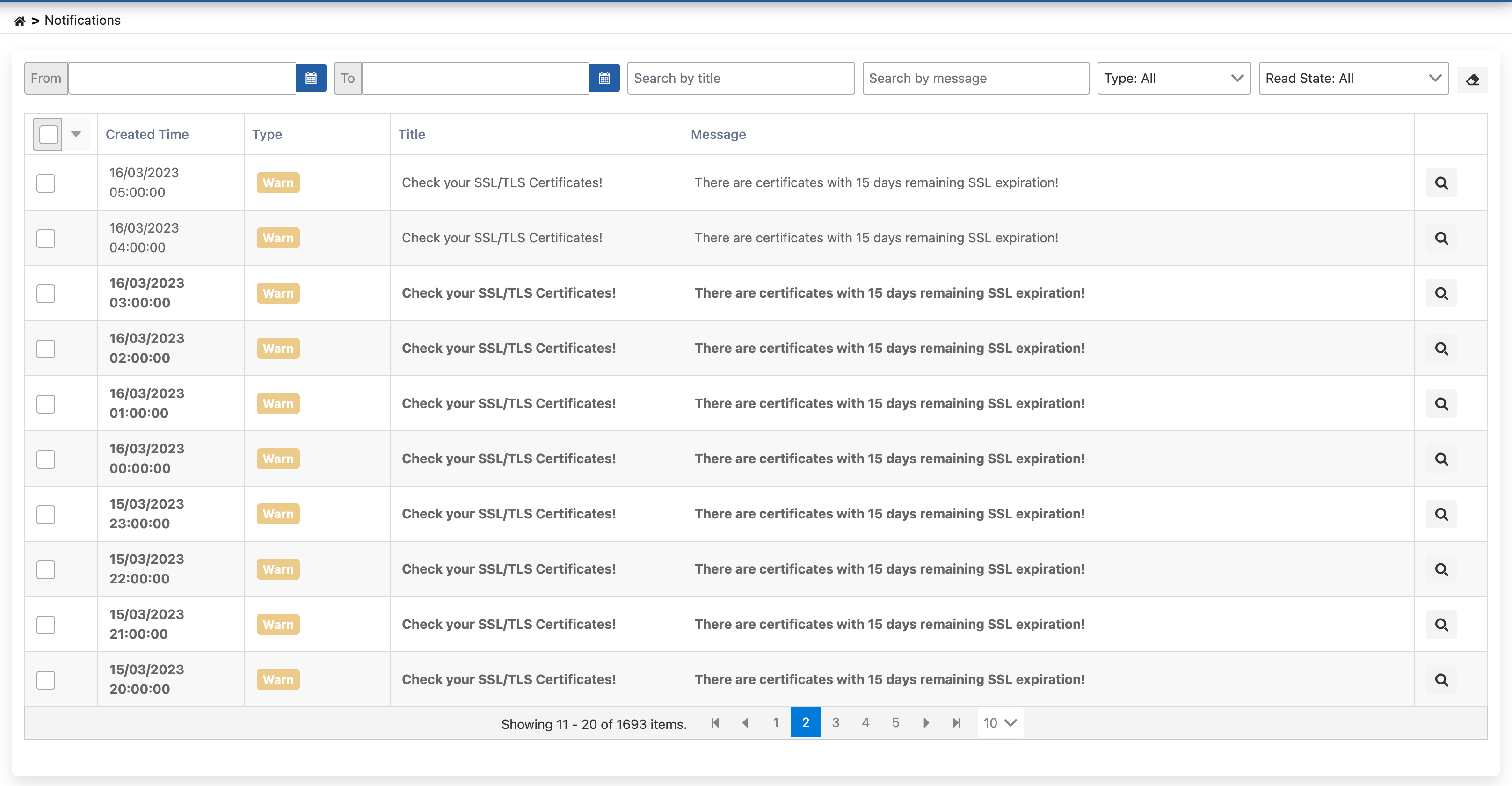 Only those produced as a result of the executed action are managed from the Notifications page. To go to this page, the Notifications or Unread Notifications link should be clicked.