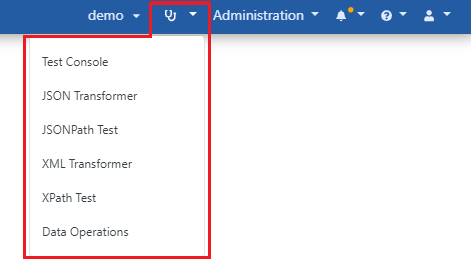The icon to the right of the project name opens the Test Tools menu. At any point in their work, users can quickly send requests to an API, test the accuracy of XPath, JSONPath expressions, or check the output of conversion codes using this menu.