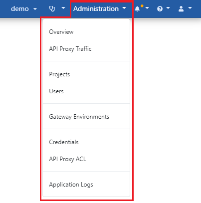 Opens a menu that contains a subset of administrative operations. If any of these items is selected, the Administration Menu opens in the main menu area.