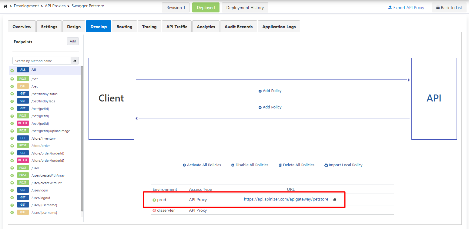 When the API Proxy is deployed, the access address appears on the interface. API Proxy is now an API for clients (API Consumers) who want to access it and is available at this address.