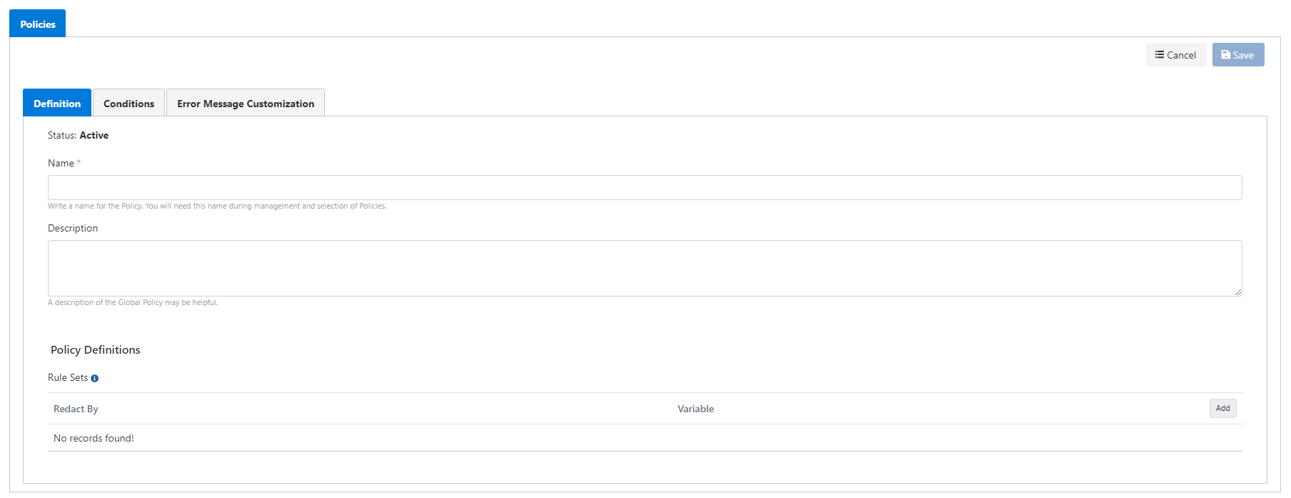 You can visit the Policies page for the details of the Conditions and Error Message Customization panels.